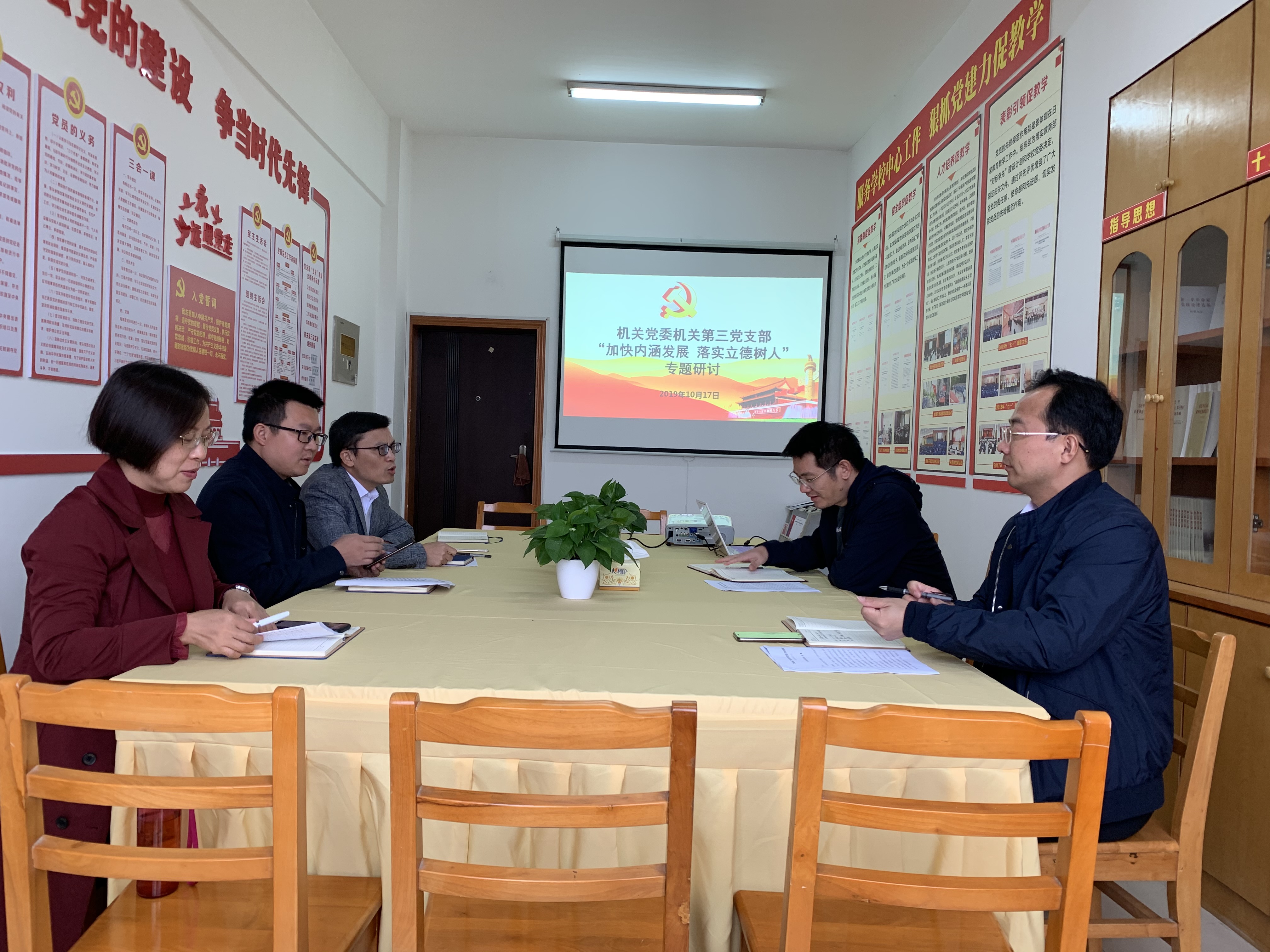 按照学校“不忘初心、牢记使命”主题教育工作领导小组的统一安排部署,10月17日下午,机关第三党支部处级干部在行政楼714会议室开展了“加快内涵发展、落实立德树人”专题研讨。支部书记黄栋主持,与会人员结合学校实际情况,围绕“立德树人”的根本任务进行了深入交流和讨论。