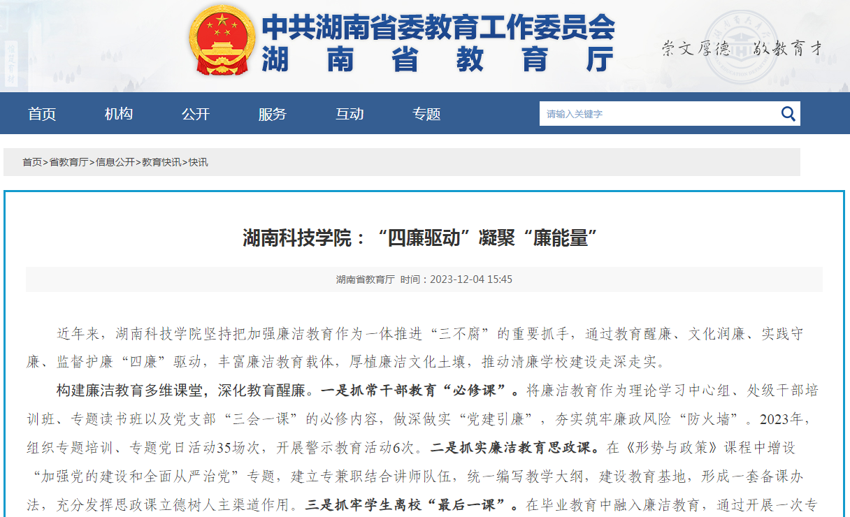 打造廉洁文化矩形阵地,深化文化润廉。一是融入校园环境。加强廉洁文化景观建设,美化了爱莲湖,兴建了廉洁文化长廊,设立了一批楼道廉洁文化宣传牌,让廉政文化景观“出门可见、随处有影”。二是融入校园文化。通过倡导《天游ty8检测中心官方登录清廉公约》,推广使用电脑廉桌面,摆放岗位廉洁风险警示桌牌,定期开展廉洁微党课、廉洁作品创作、廉洁知识抢答赛等丰富多彩的廉洁文化进校园活动,以及在电子显示屏滚动开设“今日说廉”专栏,在“清廉湘科院”微信公众号发布微电影、小故事、廉洁寄语、漫画说纪等新媒体作品,让党员干部在“实景”“实境”中接受教育。三是融入地方资源。依托学校现有湖南省舜文化研究基地、濂溪学研究基地等平台,充分挖掘运用永州红色教育资源和地方优秀传统文化,立项省级以上廉洁教育研究课题2项,不断在传承地方文化中涵养清风正气。四是融入校地合作。与永州市纪委监委、永州市教育局共同探索推进大中小学廉洁教育一体化,组织专家团队为本地5000余名大中小学生宣讲周敦颐廉洁思想,实现廉洁教育资源共建共享。指导乡村振兴帮扶点江永县邑口村将清廉文化融入清廉村居建设,成功创建“永州市清廉乡村建设示范点”。