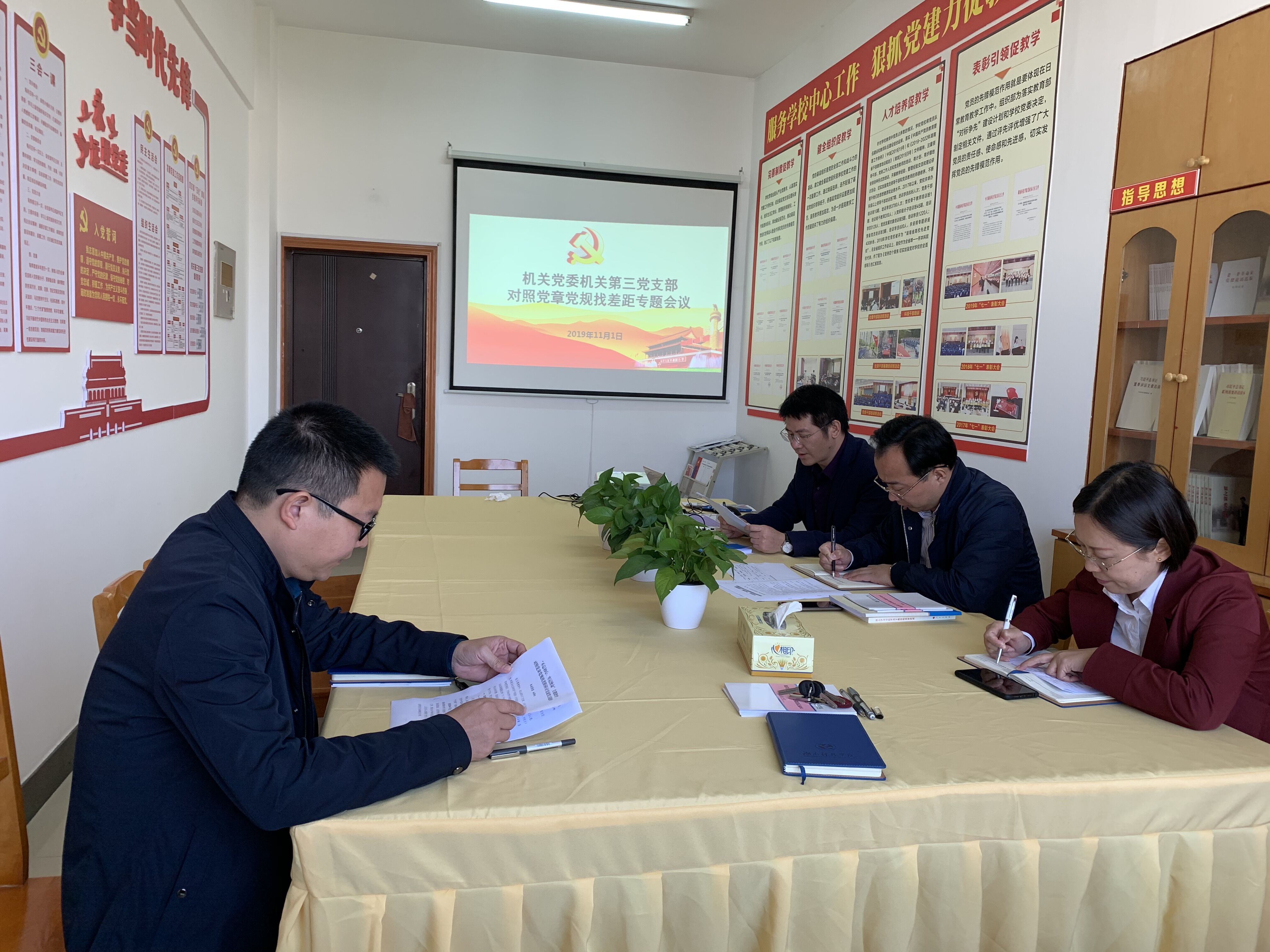 按照学校“不忘初心、牢记使命”主题教育工作领导小组的统一安排部署,根据机关党委的要求,11月1日上午,机关第三支部在行政楼714会议室召开“对照党章党规找差距”专题会议,支部副处级以上干部逐一对照《党章》《准则》《条例》等,紧扣中央提出的“十八个是否”、省委书记杜家毫提出的“十一个问题”,深入联系各自思想和工作实际,进行了问题检视,反省自查,列出了具体问题,并深刻分析了问题存在的原因,制定了整改落实的措施。