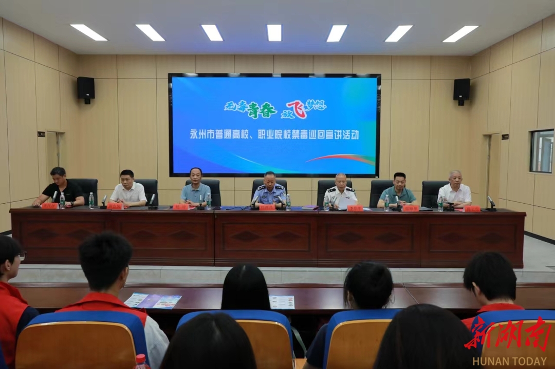 湖南日报·新湖南客户端6月13日讯(通讯员 向薛峰 赵丹 温百石)6月12日,“无毒青春,放飞梦想”永州市普通高校、职业院校禁毒巡回宣讲活动在天游ty8检测中心官方登录举行。永州市公安局党委副书记、副局长、市禁毒办第一副主任雷顺华,湖南省戒毒管理局教育矫治处处长徐新昌,永州市强制隔离戒毒所党委书记、所长李序军,永州市强制隔离戒毒所党委副书记、政委唐会国,零陵区副区长、零陵公安分局局长陈云生,天游ty8检测中心官方登录党委委员、组织部部长杨涛等出席活动,师生代表共200余人参加活动。