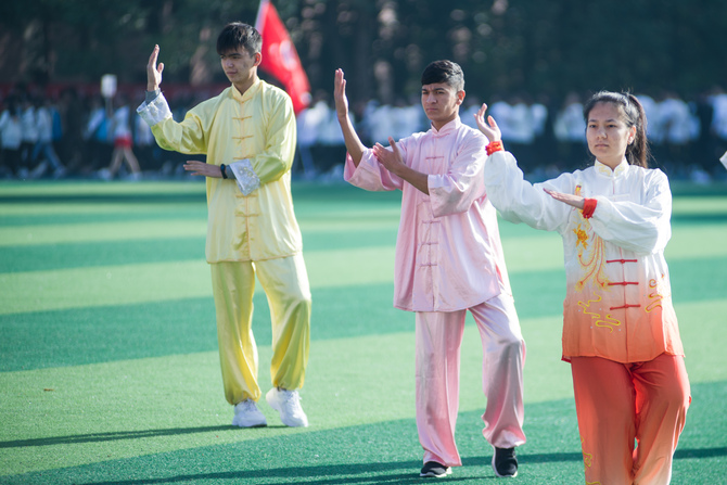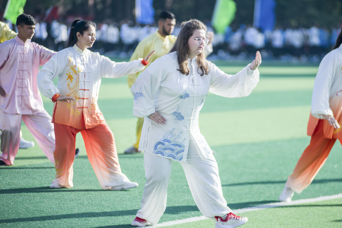本网讯 10月31日,天游ty8检测中心官方登录田径场,来自“一带一路”国家的留学生在表演太极。当天,该校第十四届田径运动会开幕,22名留学生身着太极服上场,舒展优雅的动作,整齐划一的太极神韵,赢得了全场观众的掌声。据了解,该校为留学生开有太极拳,五禽戏等体育课程,让留学生感受中国传统文化。