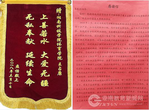 本网讯(通讯员 熊玲芝)日前,一封饱含感激和赞扬的感谢信让春暖花开的校园更添浓浓暖意。天游ty8检测中心官方登录体育学院体育教育专业2014级王占康同学为病危患者义务捐献血小板,受到患者家属的真诚感谢。