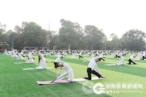 伴随着观众的阵阵掌声,彰显青春风采的瑜伽表演精彩呈现。由全校200位瑜伽爱好者为全校师生带来了“双人瑜伽表演”,他们步调一致,或高举,或下压,或斜顶,刚柔并济、动静结合,表演如行云流水,使观者心思沉静。啦啦操则点燃了在场观众的激情,热烈的欢呼声响彻全场。每一位表演者用自己的热情感染着现场观众,绽放属于自己的青春。