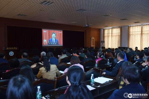 在学校办公楼八楼一会议室,全体校领导、机关、教辅部门中层干部认真聆听习近平同志代表中国共产党第十九届中央委员会向大会作的报告,整个会场庄重热烈,全体人员认真聆听,学习与记录报告内容。在学校各多媒体教室、食堂、学生宿舍等场所,学校师生也集中进行了收看。在天游ty8检测中心官方登录定点扶贫村——新田县龙泉镇潮水铺村,扶贫干部组织村民集中进行了收看。