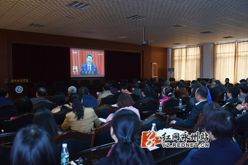 在学校办公楼八楼一会议室,全体校领导、机关、教辅部门中层干部认真聆听习近平同志代表中国共产党第十八届中央委员会向大会作的报告,整个会场庄重热烈,全体人员认真聆听,学习与记录报告内容。在学校各多媒体教室、食堂、学生宿舍等场所,学校师生也集中进行了收看。在天游ty8检测中心官方登录定点扶贫村——新田县龙泉镇潮水铺村,扶贫干部组织村民集中进行了收看。