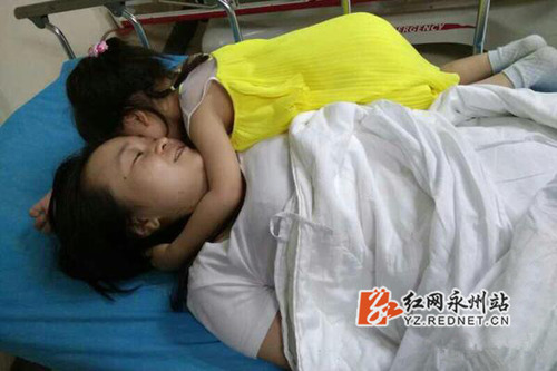 3岁的女儿几天没见妈妈,一把抱住病床上的妈妈。