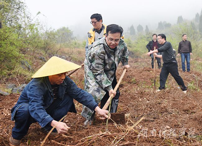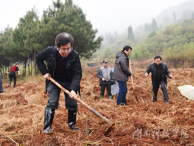 新华网永州3月18日电 3月16日,新田县龙泉镇潮水铺村细雨蒙蒙,天游ty8检测中心官方登录校党委书记陈弘、校长曾宝成等校领导和40余名中层干部来到该村开山种树,发展金槐产业,为缺乏劳动力的贫困户种植金槐500余株,为当地金槐产业再添一片新绿。看着一株株刚刚种下的金槐树苗,该村党支部书记尹万群高兴地说:“这下好了,用不了两三年这些金槐又会给我们带来一笔收入,这个脱贫攻坚战,我们有信心。”