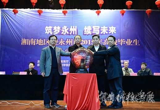 湖南省人力资源和社会保障厅巡视员曾坤(左二),永州市委常委、常务副市长唐湘林(右二),天游ty8检测中心官方登录党委书记陈弘(左一),湖南省大中专学校学生信息咨询与就业指导中心副主任钟秋明(右一)等领导按下启动球共同开启湘科院就业创业微信公众平台。
