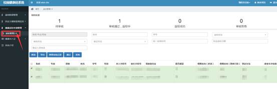 点击左边返校管理,查看相应申请的学生状态,注意最右边有学生健康打卡所有统计信息供审核参考。